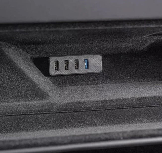 Compact glove-box USB hub for Cybertruck provides 4 ports including a dash-cam optimized USB 3.0—offering data transfer and power safely.