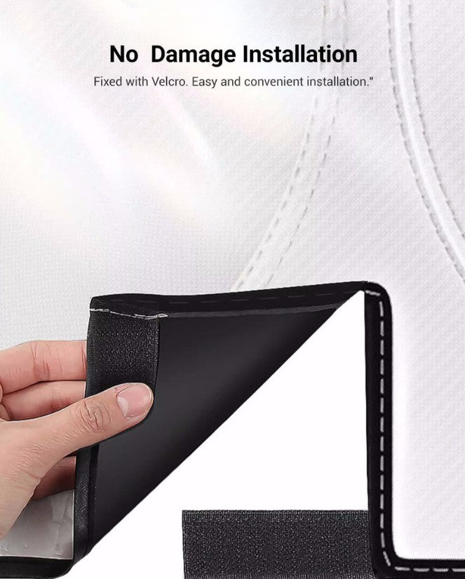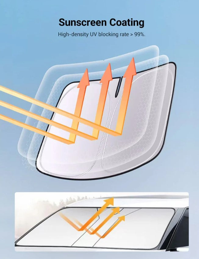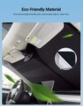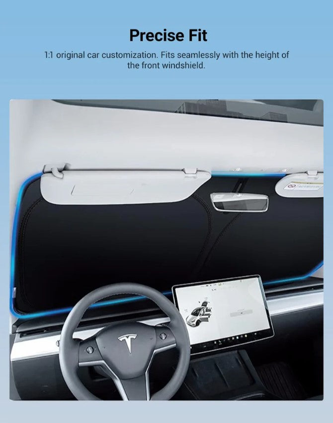 The Tespart Front Windshield Sunshade for Cybertruck is a custom-fit heat shield made from multi-layer nano-materials and aluminum film, offering 99% UV protection for Tesla’s unique windshield. Designed to match Cybertruck contours precisely, it installs easily using Velcro straps—no damage involved.